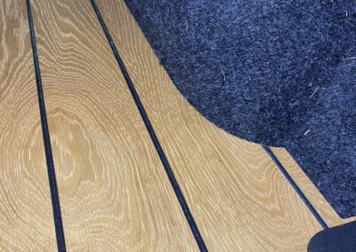 The oak floor must be bonded to prevent the wood warping, although easy in theory, achieving a perfect finish can require a certain level of attention to detail. Firstly, dry fit your floor, they are designed to fit perfectly snug after ply lining and carpet, however if any trimming is required this is the time. Secondly, we recommend filling the van rib gaps with 9mm ply for a better base support, however this is not imperative. When fitting apply an even amount of adhesive onto the ribs, we recommend soudal fix all turbo adhesive. Once the floor has been laid, apply even pressure throughout so the floor is in contact with all the ribs. Finally, the floor must be weighed down with significant weight, ensuring all the floor is in contact with the ribs and bond, this is most important over the join. An alternative to weight can be using acrow props, just ensure you are applying pressure evenly and inline with the van ceiling ribs to avoid damaging any headliners