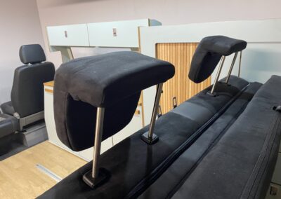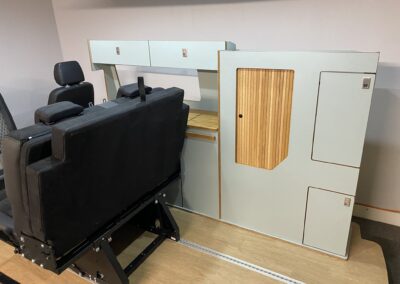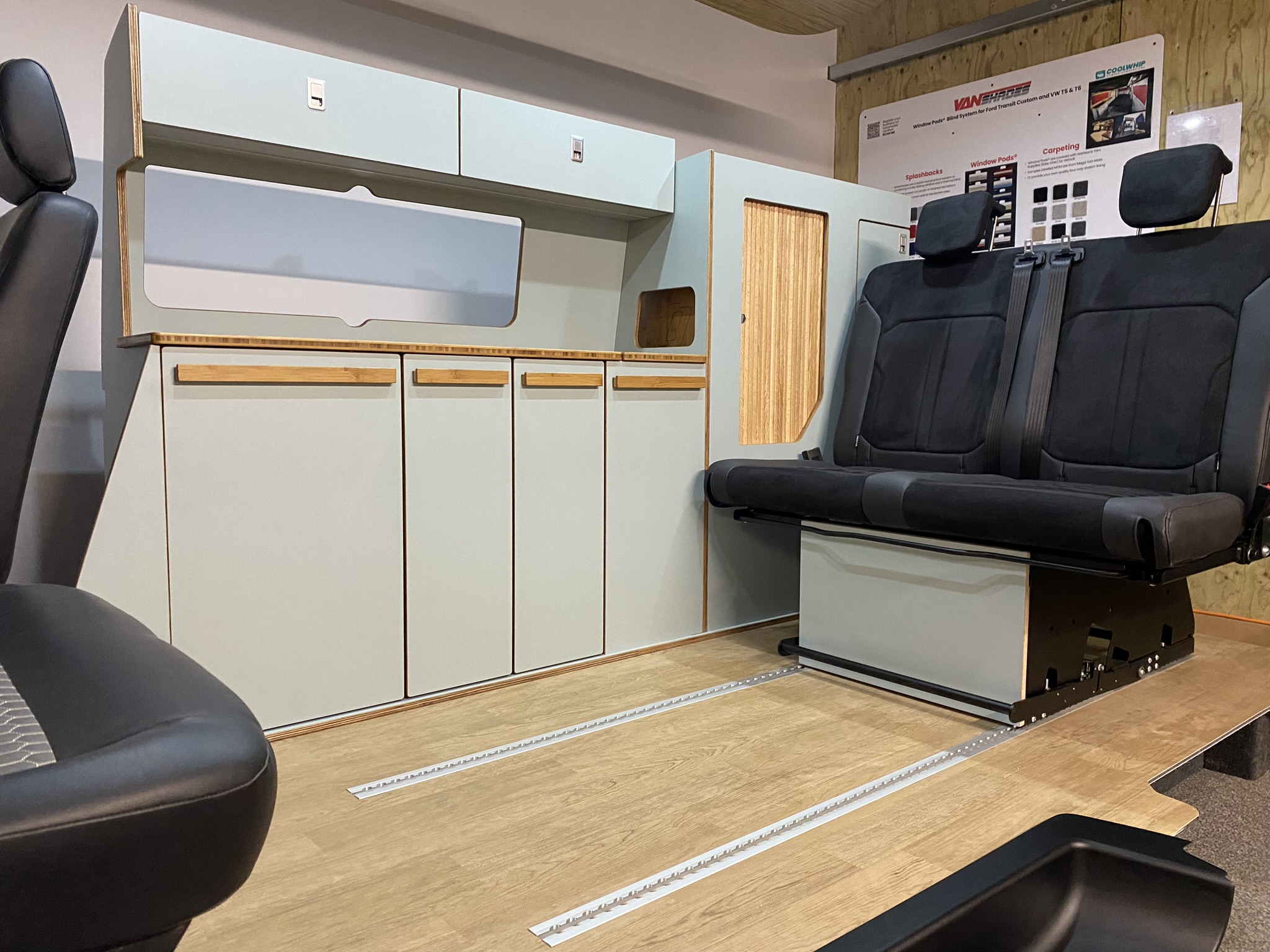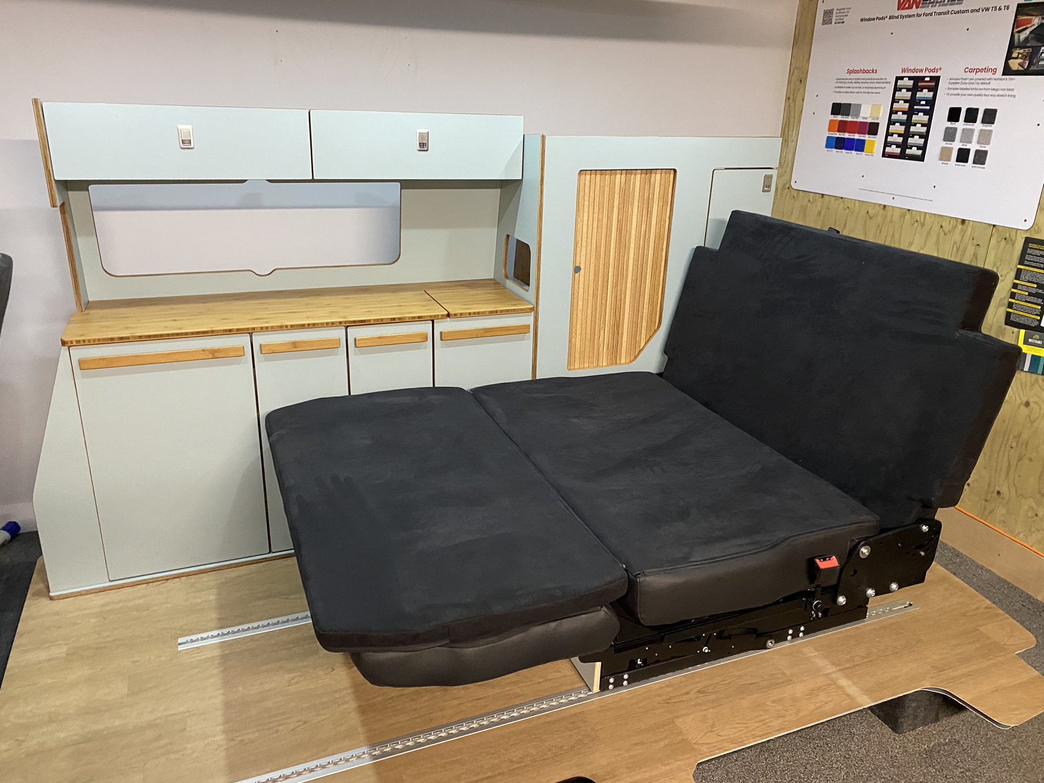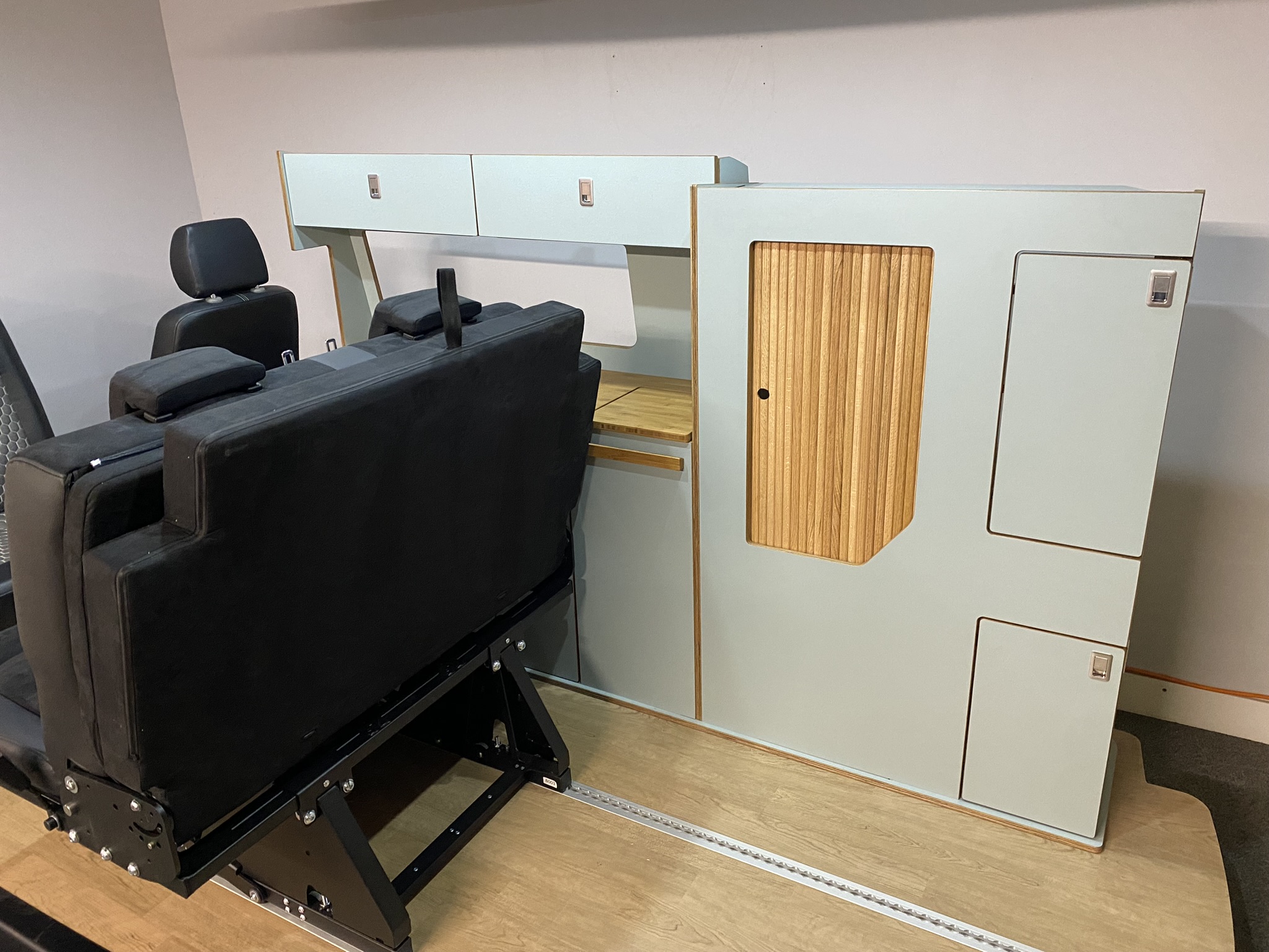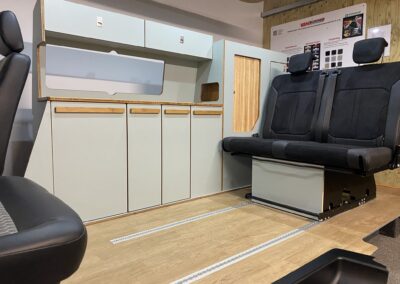 This integrated rails provide a secure and versatile mounting system for the seat/ bed. The floor is fully bonded (glued) to the vehicle, with bolts added only at the ends of the rails for extra structural reinforcement.